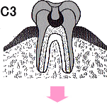 - すでに歯冠部は侵食され尽くし、ほとんど残っていません。歯髄も死んでいるので、痛みも感じなくなっています。それでも歯根がしっかりしていれば、それを生かして、C3の虫歯と同じようにクラウンで補うことができます。しかし、歯根が弱っていたり、まわりが、化膿して、「根尖性歯周炎」になっている場合、これまでは抜歯して(@)、ブリッジや義歯にする(A)、というのが一般的でした。けれど最近は、できるだけ抜歯を避ける考え方から、新しい技術が開発されています。